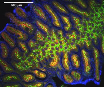 Low power survey of human ileum mucosa stained for type IV collagen (Cy2, recolored red), PGP 9.5 pan-neuronal marker (Cy3, recolored green/aqua), and Ulex europaeus agglutinin (Cy5, recolored blue). Secondary antibodies conjugated with Cy2, Cy3, and Cy5 from Jackson ImmunoResearch Laboratories, Inc.