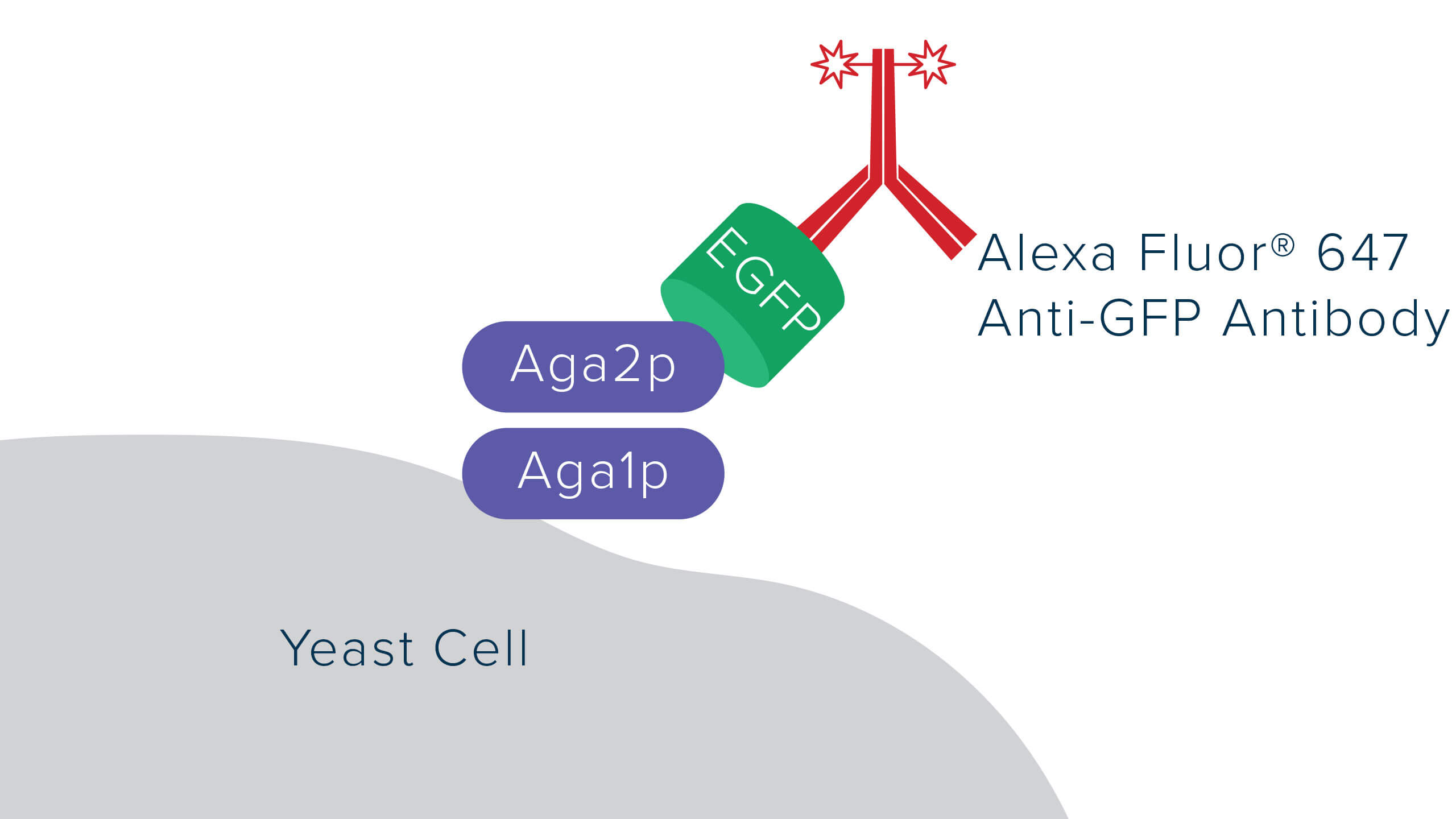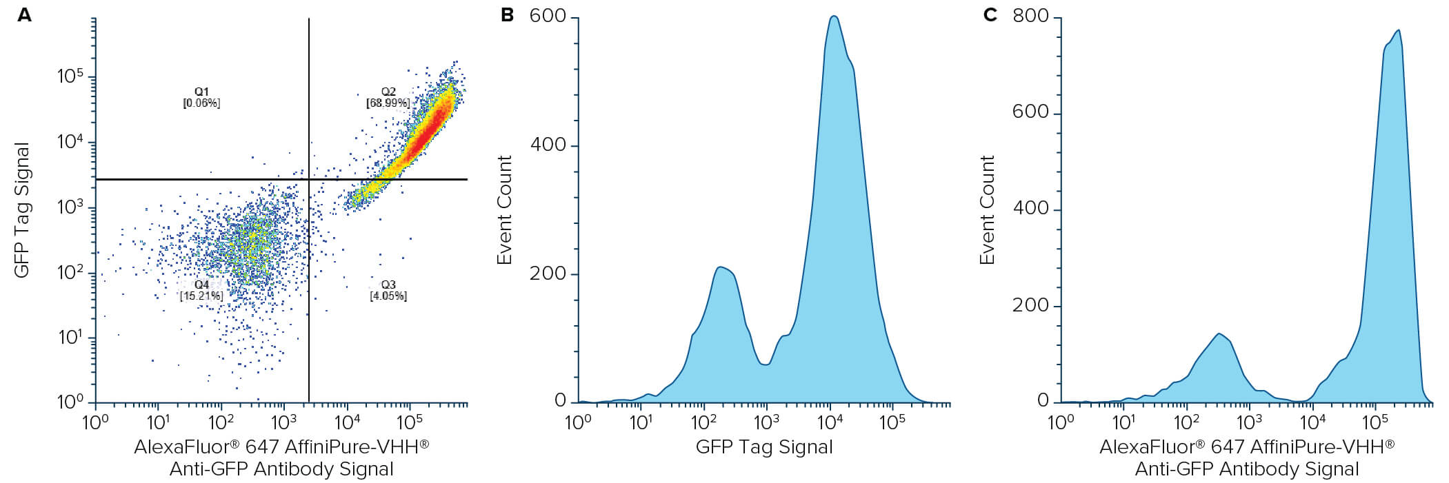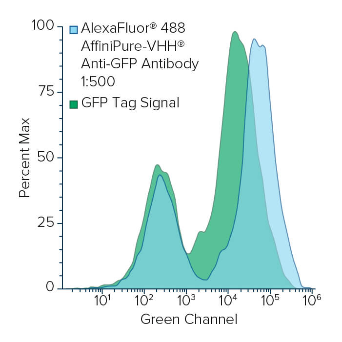 Flow cytometry is a valuable technique for screening and quantifying protein expression, particularly when proteins are located on the cell surface. Flow cytometry frequently uses the GFP tag as a reporter molecule to track protein expression. VHH domain or popularly known as a NANOBODY®, has become an important tool in flow cytometry. Due to its monovalent nature, the VHH fragment antibody enables the pre-mixing of primary and secondary antibodies, thereby reducing the time spent on sequential labeling, which could have an inverse effect on cell viability. Jackson ImmunoResearch AffiniPure-VHH® Fragment Alpaca Anti-GFP antibodies can be used in conjunction with VHH or other monovalent secondary antibodies to multi-label target proteins on cell surface. Here we demonstrate the detection of EGFP on yeast cell surface with our VHH anti-GFP by flow cytometry.