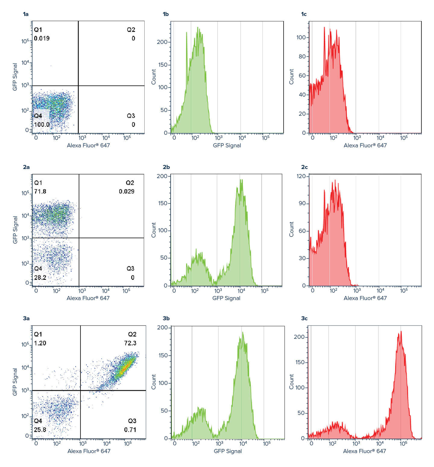 Using an Anti-GFP antibody allows the GFP signal to be amplified, with a log shift in brightness observed between the green GFP channel (Figure 3b) and the red Alexa Fluor® 647 Anti-GFP channel (figure 3c). This amplification can help improve the deconvolution of data where channels may overlap, or the signal is indistinguishable from background.