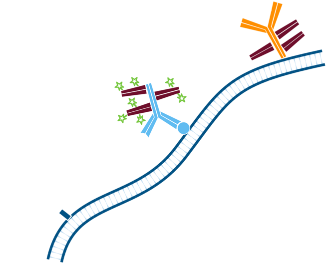 Step 6. The sample is then incubated with the Mouse Anti-Antigen Y (more abundant target) complexed with Rhodamine Red-X conjugated FabuLight (Goat Anti Mouse IgG1, Fcγ fragment specific). Wash.